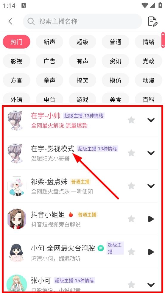 2. 在主播挑选页面,挑选心仪的主播,比如在宇 - 影视模式。