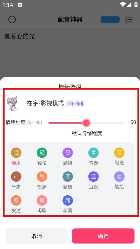 3、选定主播后,进入情绪选择页面,在此页面能够调整情绪程度,并挑选具体的情绪,设置完成后点击“确定”。