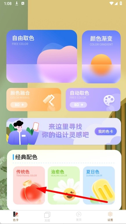 1. 开启后,在经典配色板块里点击传统色,进而进入传统色分类页面。