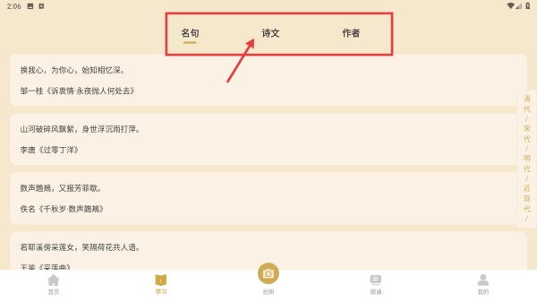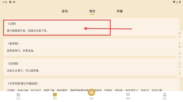 2. 在学习界面,点击诗文分类的选项,即可进入诗文展示界面。