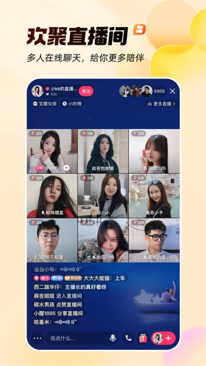 4、直播间欢乐相聚:多人实时在线畅聊,为你带来加倍陪伴。