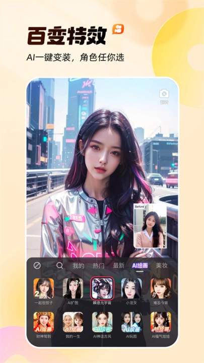 5、多样特效:借助AI一键实现变装,各种角色随心挑选。