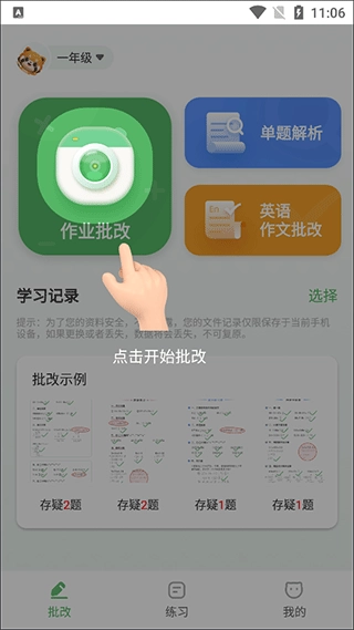 2. 在首页,能看到作业批改、单题解析、英语作文批改等功能,点击“开始批改”。