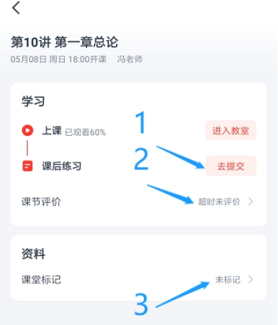 3. 课程结束退出后,你既可以在练习板块提交巩固作业,也能够在课节评价处提出一些小建议,同时还能在下方资料中查看标记的内容。