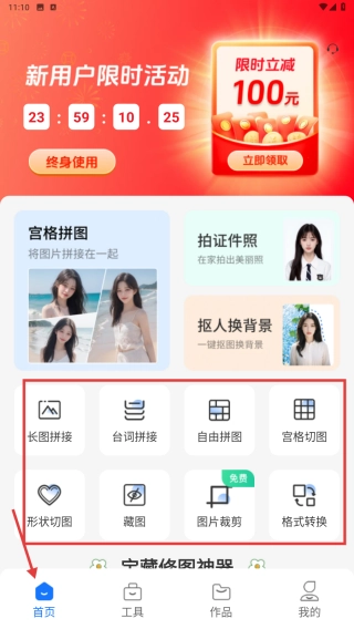 1. 来到图片处理首页,即可参与新用户限时活动,这里能使用宫格拼图、拍证件照、抠人换背景等功能,还能选用长图拼接、台词拼接等工具对图片进行处理。