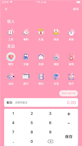 4. 新增收支记录:于账本首页,用户能够依据日期、分类、金额等相关信息添加收支记录,且拥有多种分类方式可供选择。