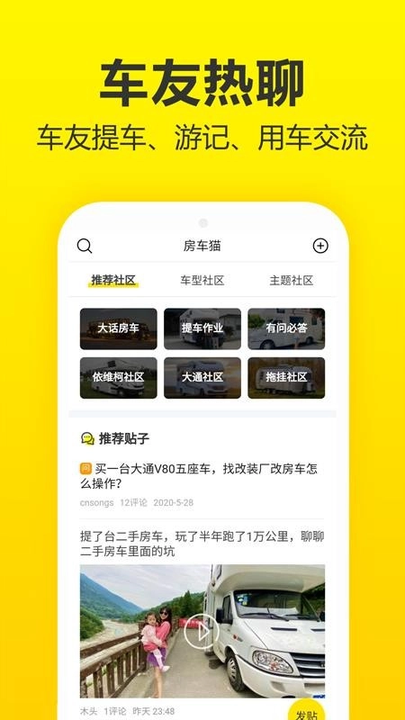 1. 房车社区,不仅可以在此分享房车相关内容,还能与大家一同探讨交流,并且在购买房车前,你还能听取到真实可靠的意见。