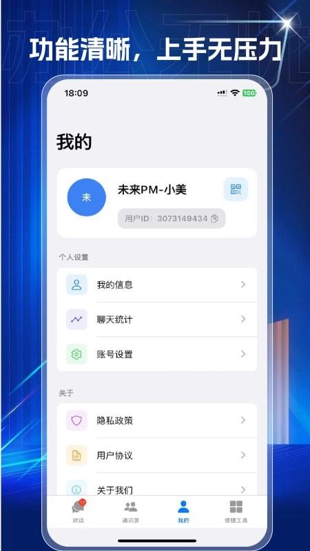 5、于个人中心,可查看个人信息、聊天统计等内容,并且能够对账号进行自定义设置。
