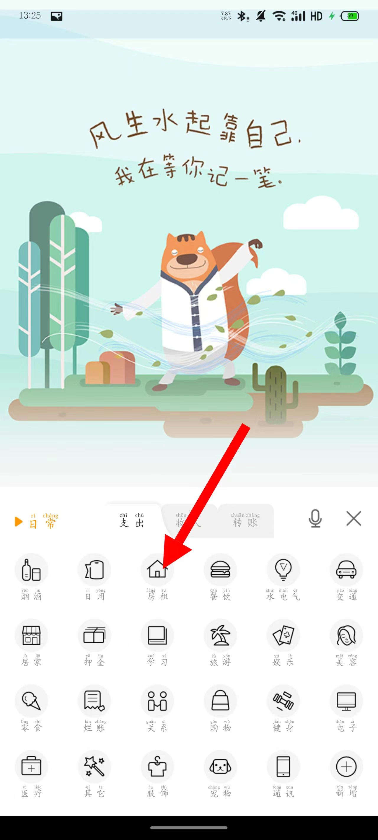 3、于消费类型界面,挑选房租分类,进而进入房租支出记录页面。