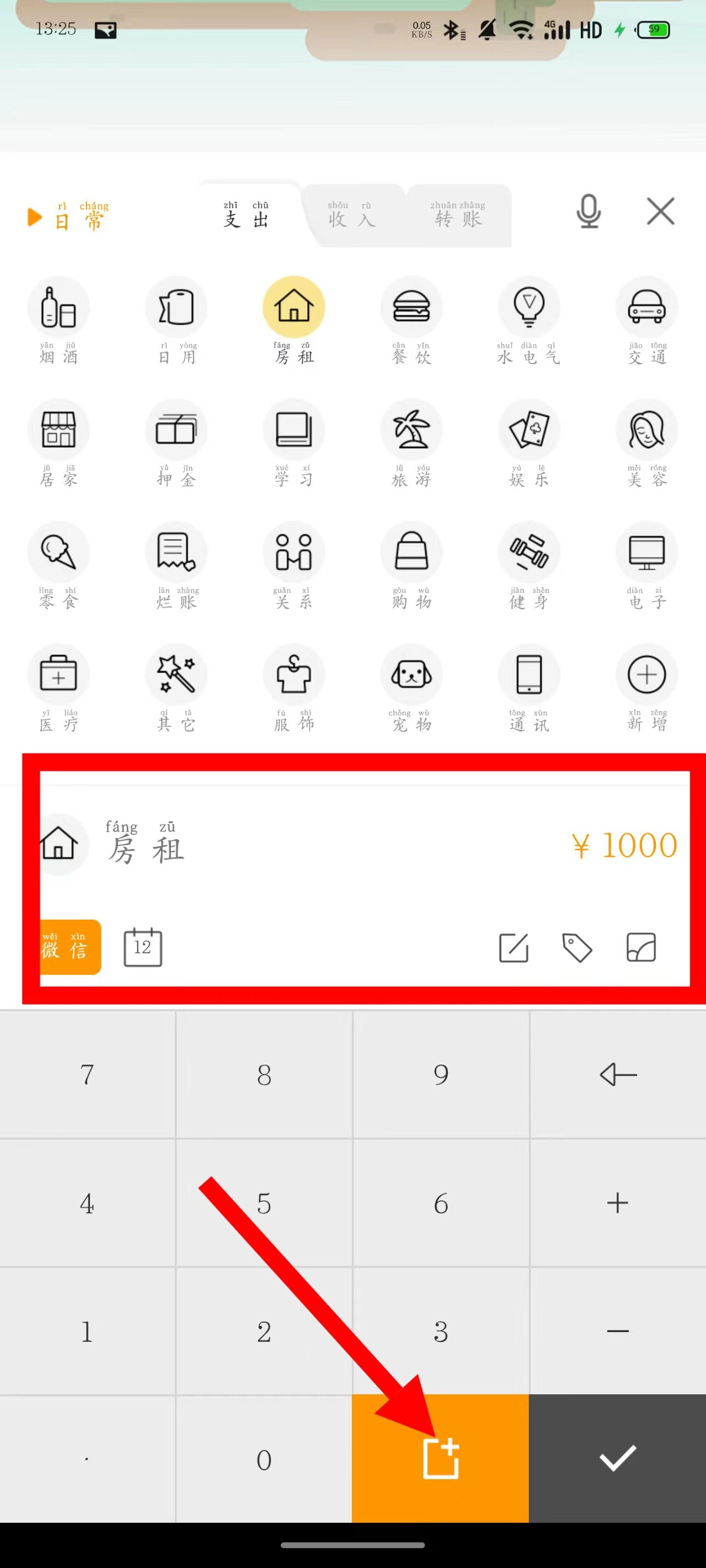 4、填入支出金额,挑选支付方式、日期等相关信息,点击确认按键,从而完成房租支出的记账步骤。