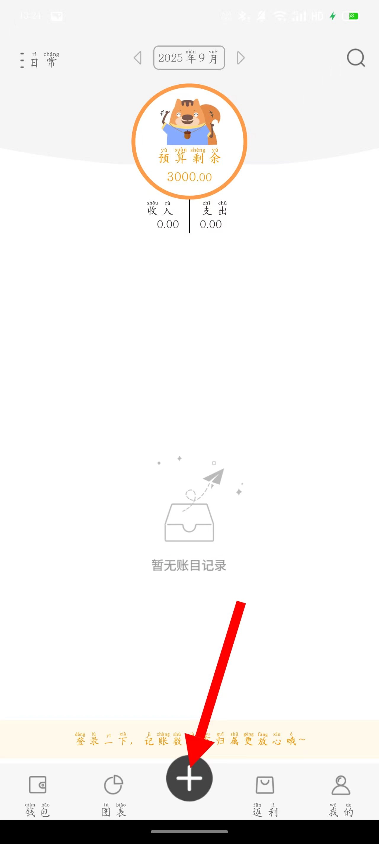 2. 在明细页面,点击底部中央的“+”按钮,即可进入消费类型选择界面。