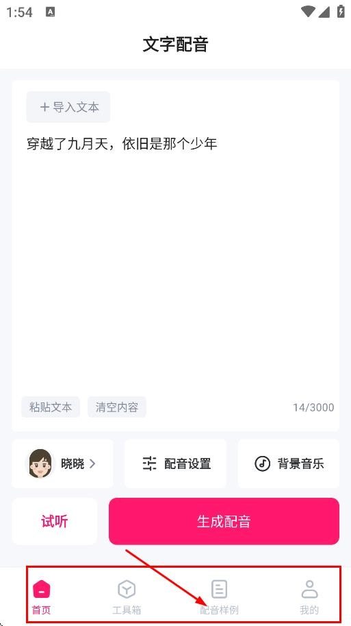 2、于文字配音页面,轻点底部的配音样例,即可进入配音样例页面。