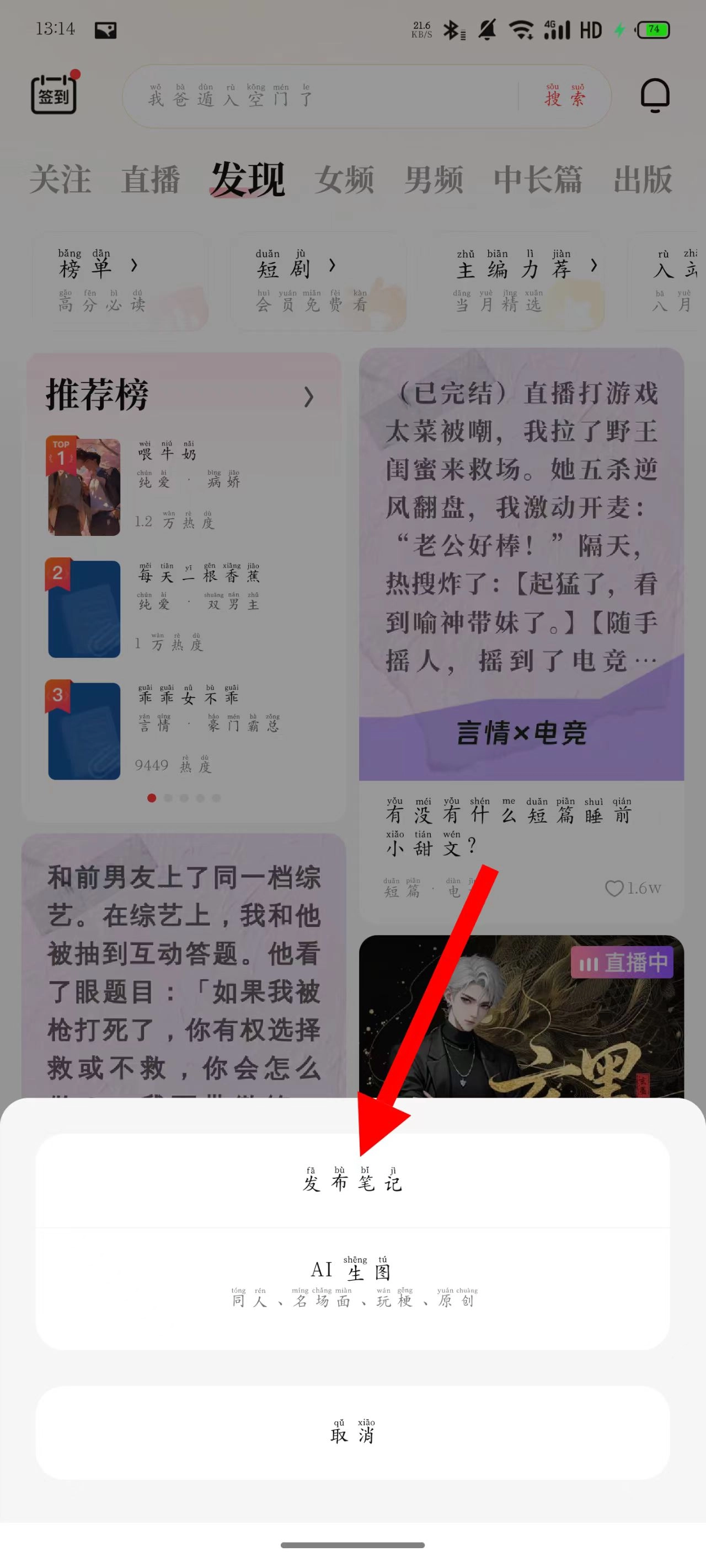 2. 轻点右下角标有加号图标的创作按钮,随后在弹出选项中选取发布笔记这一项。