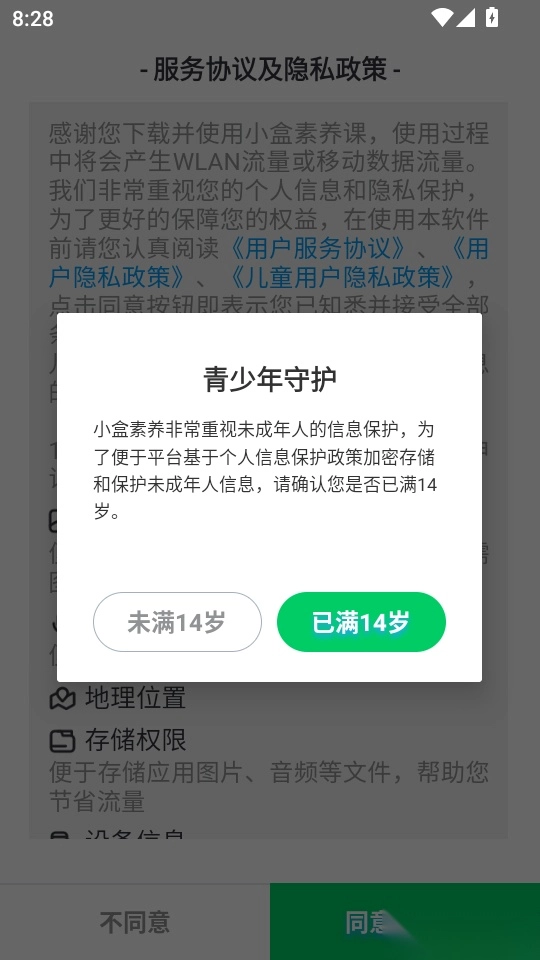 2、接着便能看到青少年守护的提示,点击“已满14岁”即可进入。