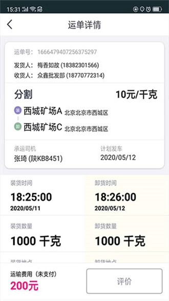 3、如需查看支付信息,可直接浏览运单详情。若想查看评价详情,点击相应位置即可。