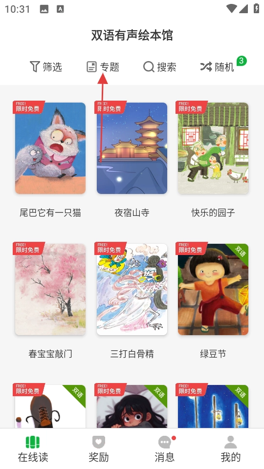 1. 在双语有声绘本馆的页面上,找到并点击专题选项,随后即可进入专题页面。
