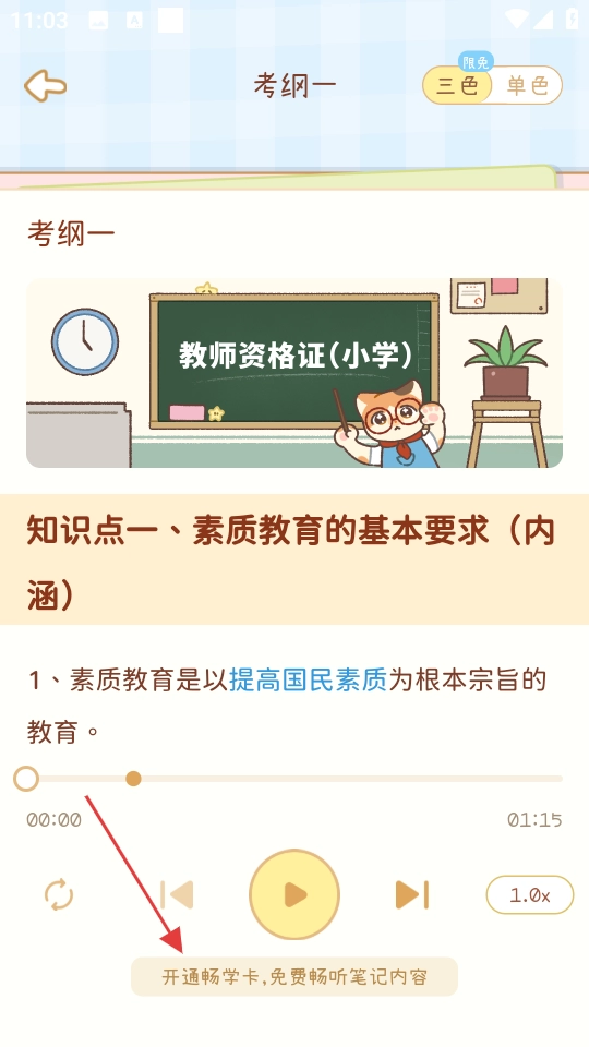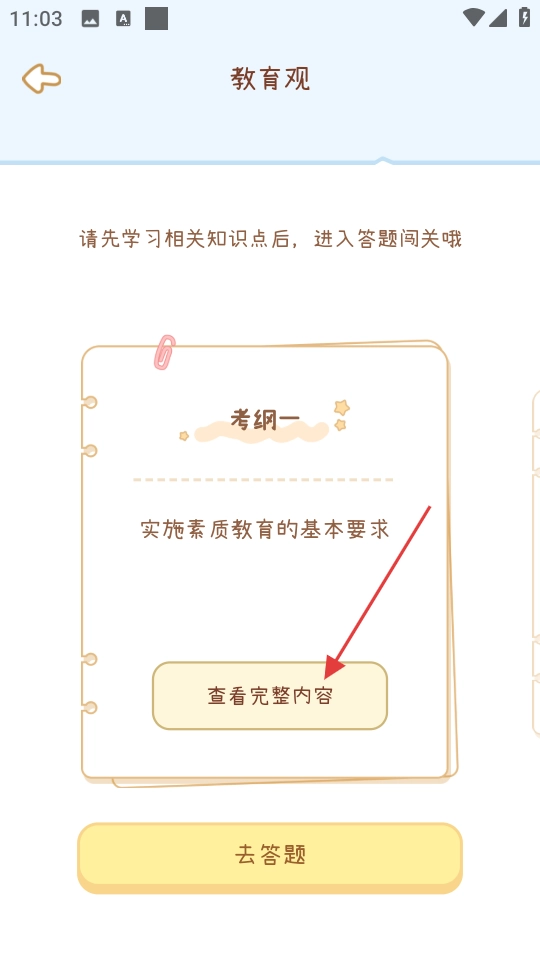 2. 在教育观页面,点击“查看完整内容”,查看考纲一的全部知识点。
