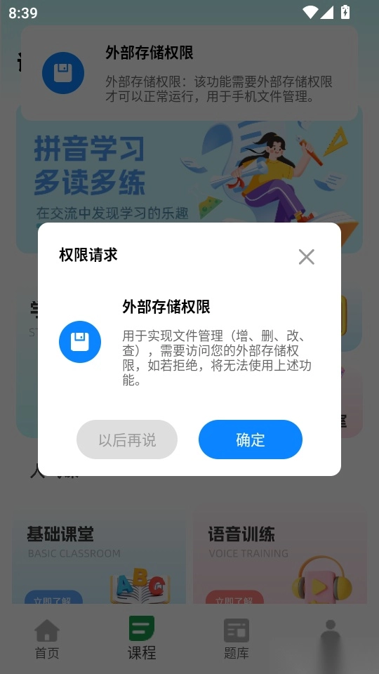 4. 随后,屏幕上会弹出“权限请求”的弹窗提示,点击“确定”按钮,即可进入下一步。