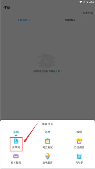 3、随后在下方挑选【作业类型】,各学科的作业类型不尽相同,这里我们以背单词作为示例。