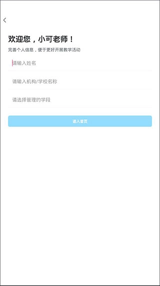 2、若为首次登录,输入验证码便能进入软件。随后完善个人姓名、机构/学校名称以及管理的学段信息,即可成功完成注册。