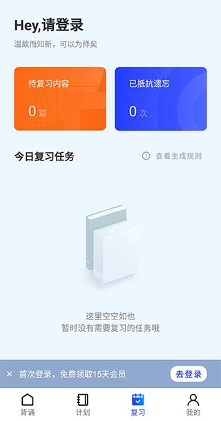 3、当用户进入【复习】页面,映入眼帘的有待复习内容以及今日复习任务。用户完成这些任务后,能切实增强对背诵内容的记忆。