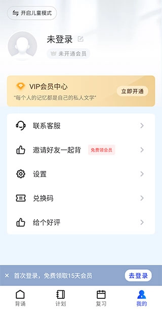 4、若用户希望正常使用软件的所有功能,需前往【我的】页面进行注册登录。开通滑板车背诵的VIP,还可获取更高权益。
