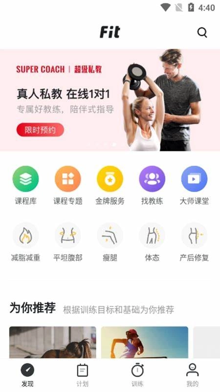 1. 开启Fit健身应用,轻点底部导航栏里的“发现”选项,从而进入内容浏览页面。