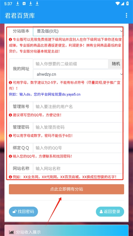 2、妥善设置登录账号及密码,确认信息准确无误后,点击“立即拥有分站”,完成注册操作。