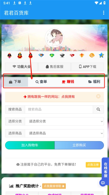 1. 开启君君百货库,进入首页后,主要功能模块会得以展示,像下单专区、查单专区以及福利专区等都包含在内。