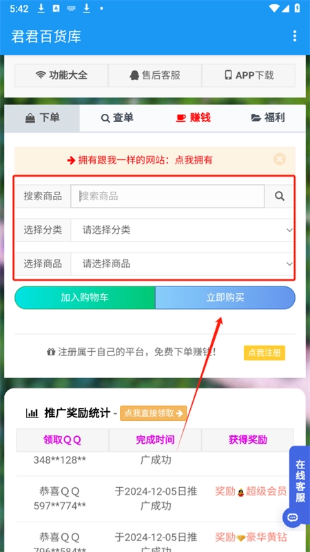 2. 点击“下单”功能,通过分类来浏览商品,挑选好后点击“立即购买”,从而完成下单流程。