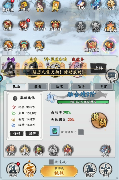 2、点击渡劫即可对其伙伴渡劫,成功系统界面会显示,并提升伙伴基础属性。