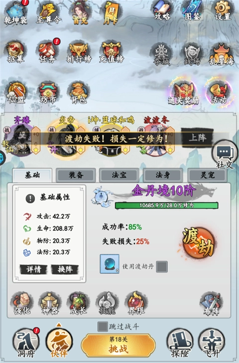 3、如失败也将显示,玩家可以通过使用使用渡劫丹确保渡劫成功。