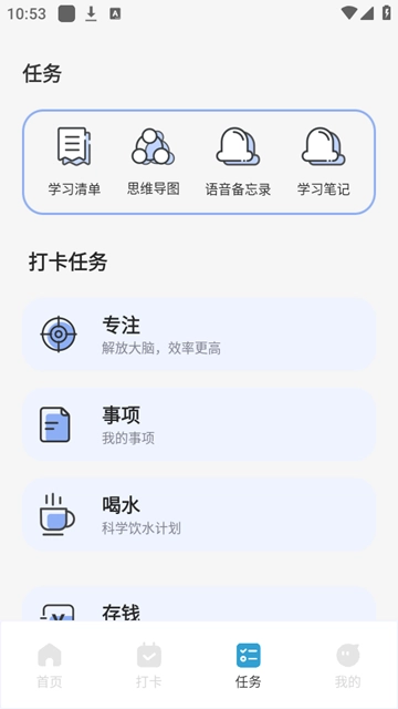 6、“任务”板块中包含大量打卡任务,像存钱、喝水、记录生理期等,你能够随时挑选并使用。
