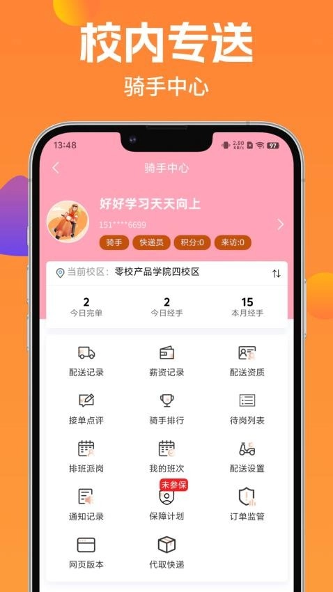 校内专送是专为大学校园打造的校园跑腿平台。商家能在该平台快速发布订单,方便配送员及时接单,有效缓解配送员日常找单困难的状况。配送员在平台上可查看所有接单配送记录,利于规划配送量与计算收益,让配送工作变得更加简单便捷。感兴趣的配送员和商家,快来体验吧!