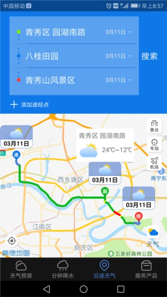 【沿途天气】基于地图形式展示,用户出行路线的天气情况。