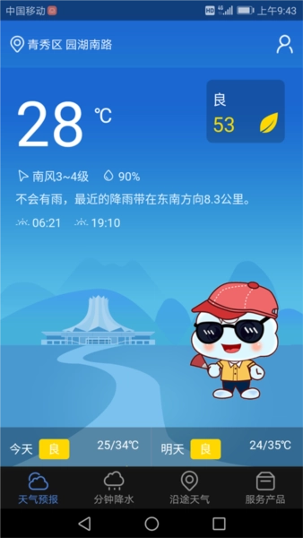 【天气实况】展示天气实况,包括空气质量、温度、湿度、风向风速、分钟降雨预报、日出日落等要素。