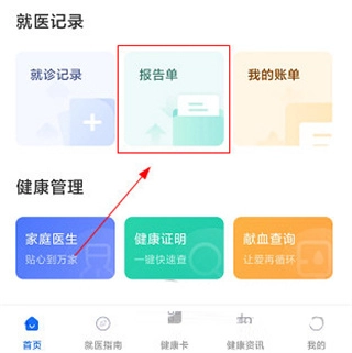 1. 开启健康临沂,进入首页面后,点击“报告单”。