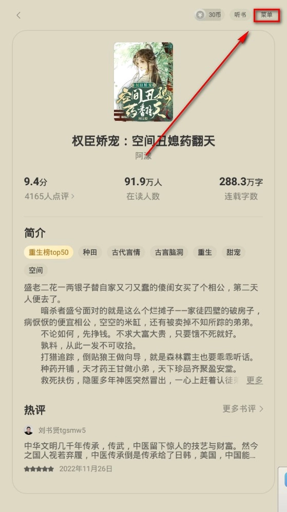 进入小说简的详情页面后,点击【菜单】。