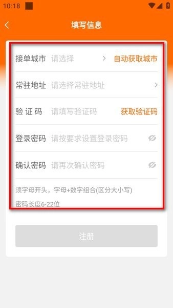 请填写接单城市、常驻地址、登录密码等相关信息,然后点击“注册”。