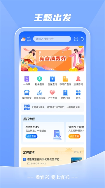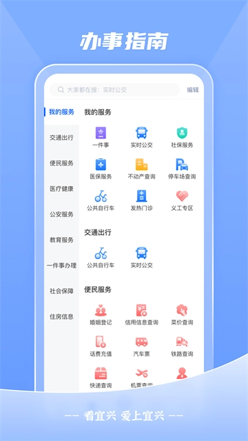 看宜兴是一款宜兴市的便民政务软件,这里会实时速递宜兴市得的新闻资讯,超多热点内容尽在这里。这里支持查询本地居民的社保、公积金、不动产等的状况,在网络上就能够办理好很多业务。还可以在这里查看实时公交,扫码骑车,寻找法律咨询,还有超多的便民服务为你提供,软件界面简单易用,喜欢的快来吧!