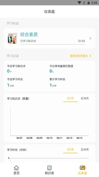 4、最后还可以通过“仪表盘”功能看到自己近期的学习记录以及掌握的知识点。