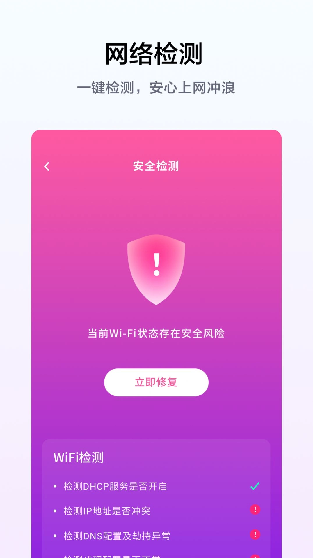 WiFi连接钥匙管家,一款超实用的WiFi管理软件。要是手机尚未连上WiFi,它能自动帮你连接附近可用的WiFi。不仅如此,这款软件还能检测网络,并且支持测速与加速功能,让你畅享更快速的网络体验。在这里,调整WiFi密码无需繁琐操作,一键即可完成,软件操作简便又快捷。感兴趣的小伙伴,赶紧行动起来吧!