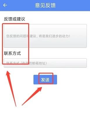 4. 打开意见反馈窗口,在相应位置填写反馈或建议内容,并留下联系方式,接着点击【发送】按钮,这样就能完成意见反馈。