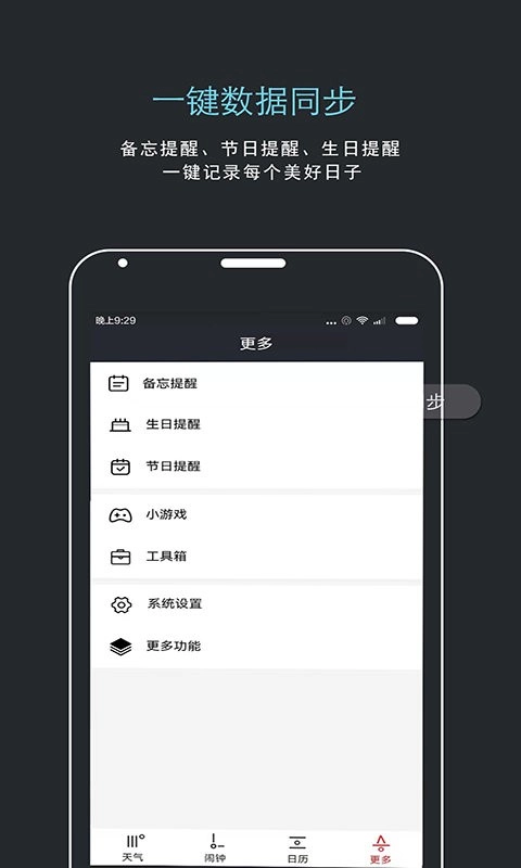 【同步功能】支持 QQ、微信一键登录,轻松备份并同步闹钟提醒数量。同时,手机联系人可一键同步至云端,换机时还能一键恢复到新手机。从此,换手机不再令人烦恼。