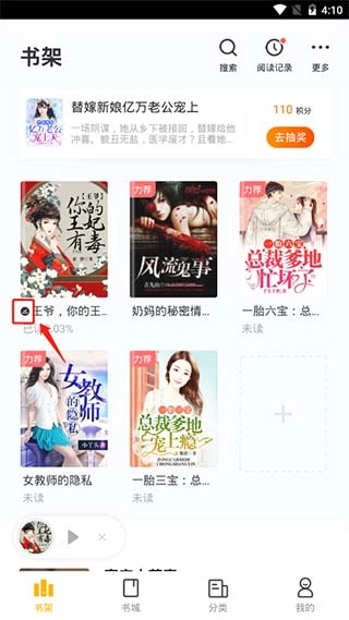 4、在书架中能够看到优质小说,若出现这个黑色标识,就表明缓存成功,可离线观看。