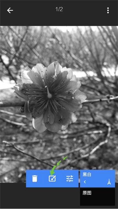 3、在手机右上角,你会瞧见一个类似“1”的数字,点击它。此时会出现“黑白”与“原图”选项,接着再点击“黑白”。