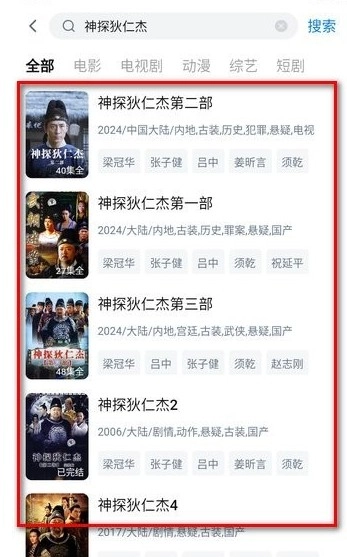 2、当你搜索“神探狄仁杰”时,所有名字相关的电视剧都会呈现出来,如下图所示,即为神探狄仁杰系列。