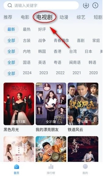 1. 可在“首页”顶端的搜索框,直接输入想要观看的电视剧名称,或者主演姓名进行搜索。