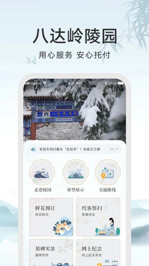 八达岭陵园推出的最新版智慧祭扫客户端功能全面,不仅能查询八达岭陵园的所有展示内容,还提供鲜花预订、代客祭扫、墓碑实景、网上纪念、陵园介绍等服务。同时,可查询陵园的自然景观、风景以及绿色生态情况,全方位覆盖墓业服务,为有需求的朋友打造一站式预订祭扫服务。