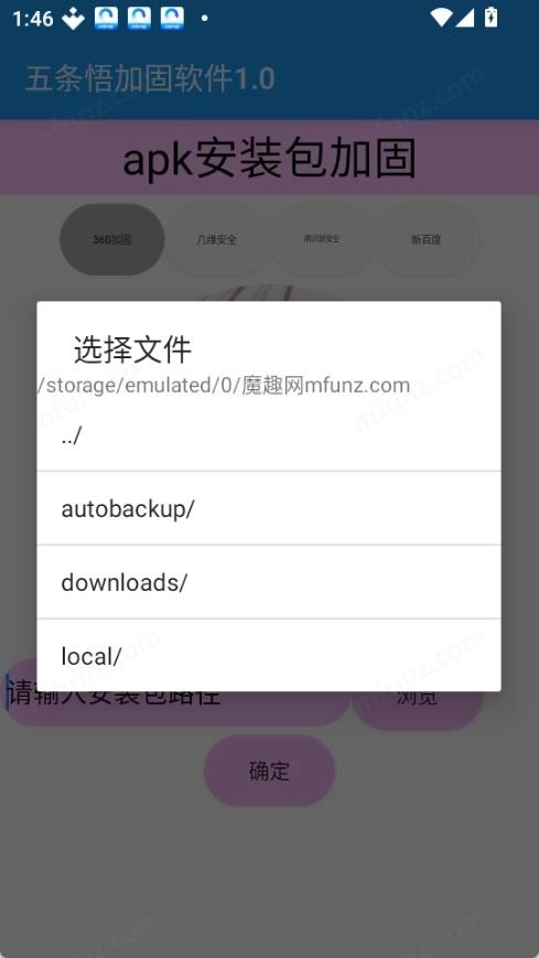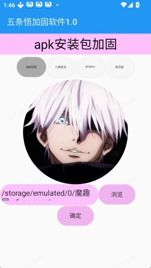 1.打开五条悟加固软件,点击浏览选择需要加固的APK文件。